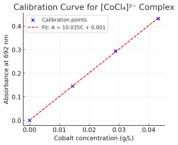 The color intensity of this complex is maximized in acetone, where water activity is low and the tetrahedral geometry is stabilized. The resulting solution exhibits a sharp absorption band at 692 nm, characteristic of the d–d transition in [CoCl₄]²⁻. This makes the absorbance at 692 nm a direct measure of cobalt concentration.